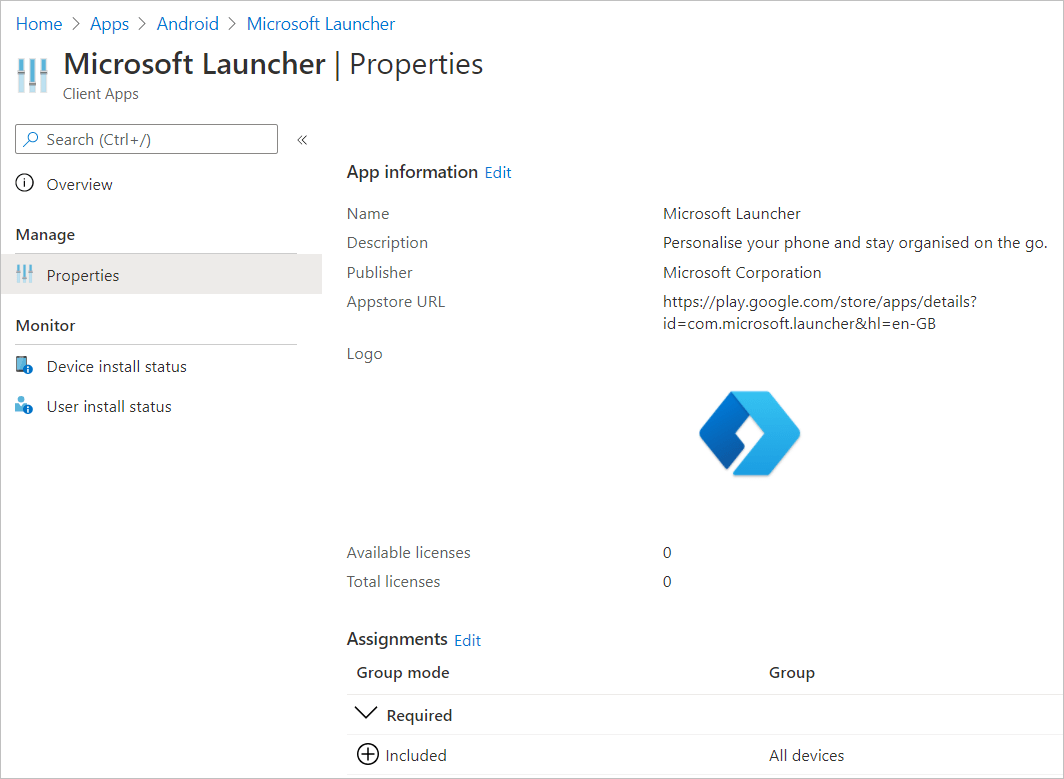 The Microsoft Launcher should appear in your list of applications within Intune, once listed (it may take 2-3 minutes to appear), once present, deploy the application to your test devices, in my tenant I only have a few Android devices, so I have deployed it to all (You should not do this in production unless testing has taken place):