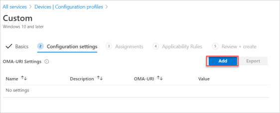 Select Windows 10 and later as the platform and profile type of Custom and then Create:
